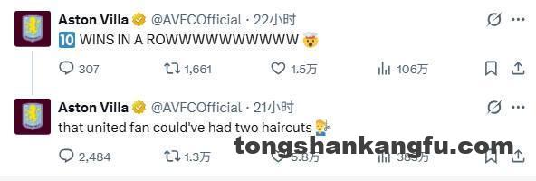 在周一凌晨进行的英超第17轮比赛中,维拉主场2-1击败曼联,豪取各项赛事10连胜。