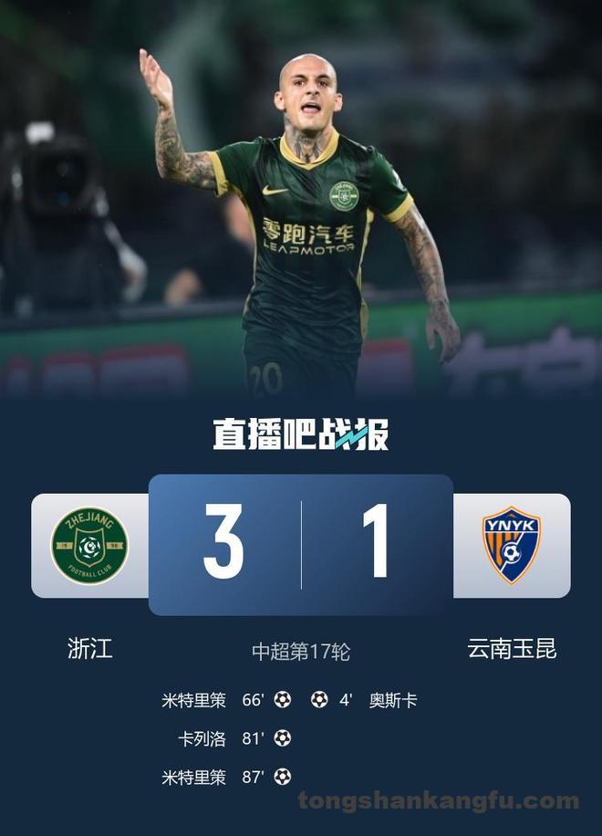 直播吧7月18日讯 中超第17轮,浙江主场迎战云南玉昆,比赛在杭州黄龙体育中心进行。上半场,侯永永助攻奥斯卡闪击破门,王钰栋失良机。易边再战,米特里策个人秀+任意球直接破门,浙江新援亚戈-卡列洛首秀替补建功。最终浙江队3-1云南玉昆。积分榜方面,浙江队23分暂升第七,玉昆22分第八。