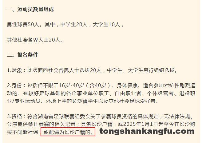 “湘超”要来了,长沙市足协发布足球集训队招募公告,配偶是长沙籍的球员也可以报名!“苏超”火爆之后,全国所有省份都是非常羡慕江苏搞出一个超级体育大IP,所以马上就有一些省份跟进,当然有些省份也意识到自己没有条件举办像“苏超”这种规格的足球赛事。我认为,只要是有条件组织举办城市足球超级联赛的省份,都应该借助“苏超”联赛火爆的机会,这也是一种蹭流量的方式,而且也可以把本省的群众足球运动氛围营造起来,同时通过举办赛事撬动文化、旅游和商业经济的发展。目前已经学者“苏超”开始举办类似赛事的已经有浙江的“浙超”、江西的“赣超”,最新消息还有湖南的“湘超”也要跟进了,长沙市足协发布了足球集训队招募公告,要招募50名球员,其中,中学生20名,大学生10名。长沙招募球员的资格条件大部分都和“苏超”联赛的资格条件类似,但是长沙有一个条件就特别有意思,允许配偶是长沙籍的球员报名,这个条件真的太好了,这是鼓励那些长沙女婿和长沙媳妇,来了都是长沙人。