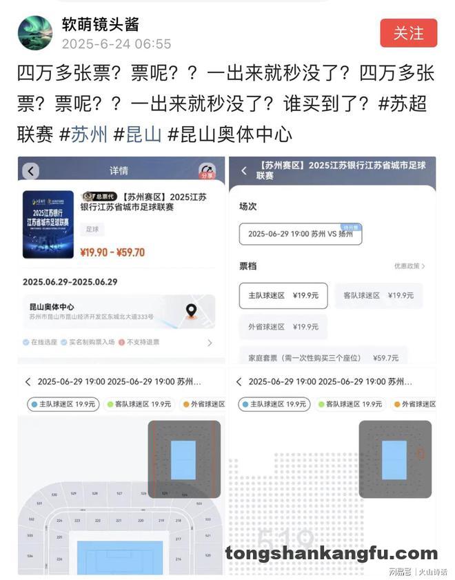 6月24日有网友发帖,四万多张票?票呢??一出来就秒没了?四万多张票?票呢??一出来就秒没了?谁买到了?#苏超联赛 #苏州 #昆山 #昆山奥体中心