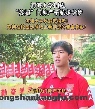 在苏超赛场,盐城队25号门将严子航表现出色。这位仅17岁的年轻人在采访中表示目标是河海大学。这座江苏省内的211高校也对严子航表达了欢迎。