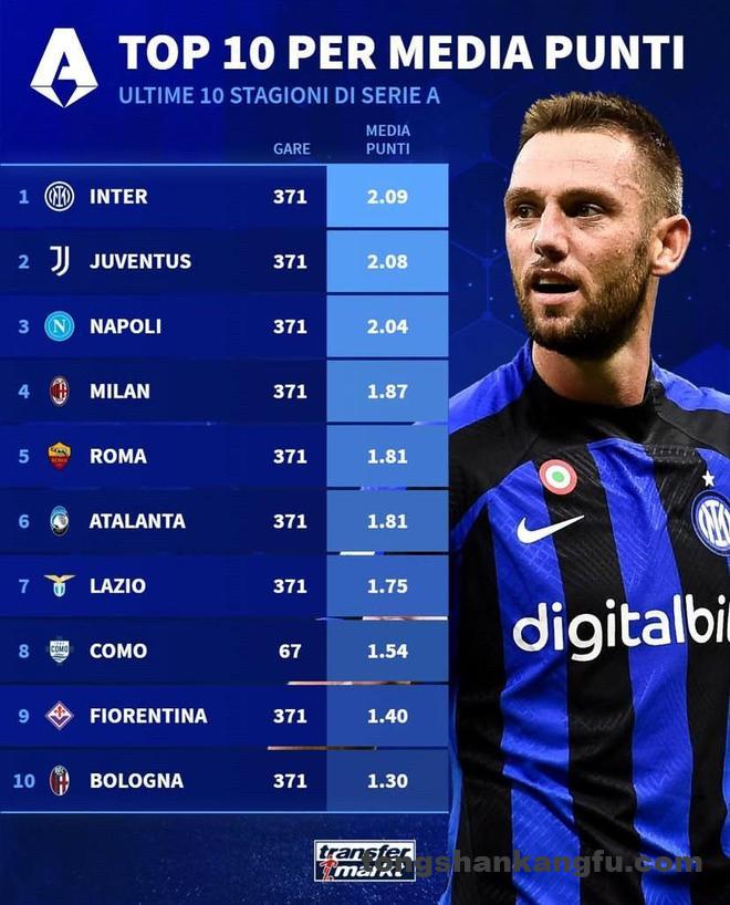 北京时间3月21日,德转统计出了意甲近10年的场均积分排名,国际米兰以2.09分位列第一,尤文图斯2.08分第二,那不勒斯2.04分第三,AC米兰1.87分第四。