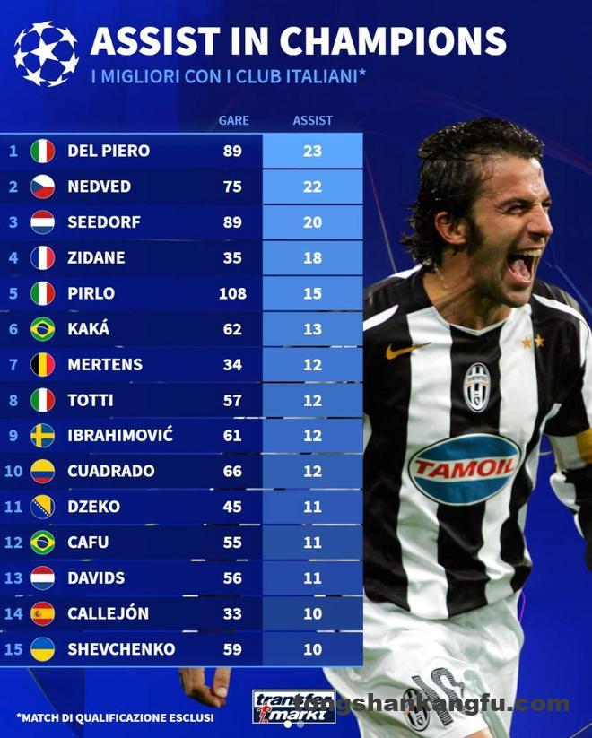 北京时间3月21日,德转统计出了意甲球员欧冠历史助攻榜,德尔-皮耶罗以23次助攻位列第一,现役球员中夸德拉多排名最高,他以12次助攻位列第10位。