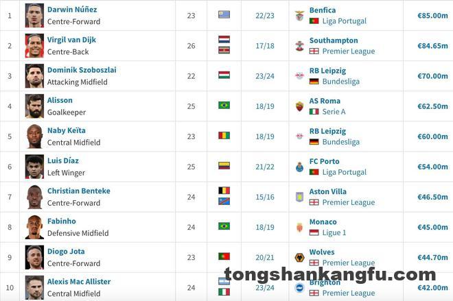 据多家媒体报道,德转列出了截至目前利物浦在转会市场花费的TOP10,努涅斯以8500万欧转入利物浦排行第一。