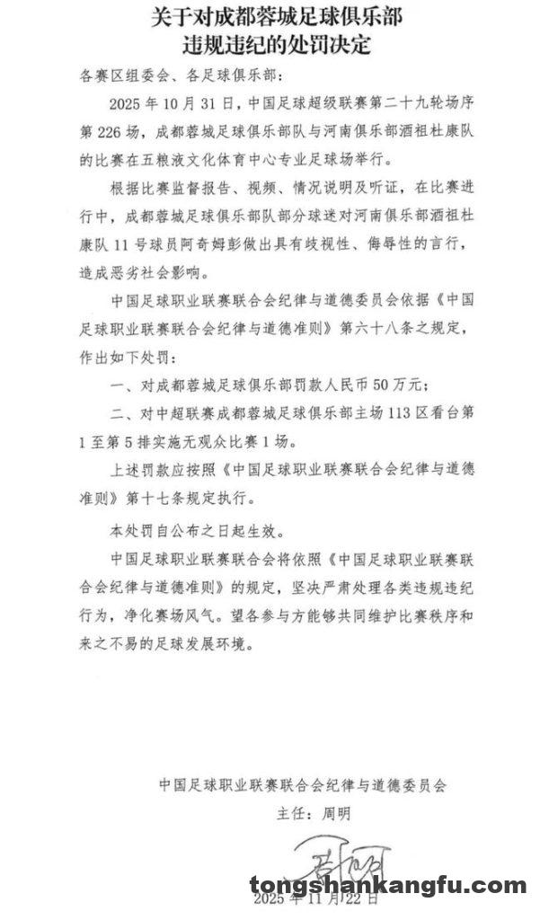 中足联官方发布公告,因成都队部分球迷对阿奇姆彭有歧视侮辱言行,对成都蓉城俱乐部罚款50万元,对其中超联赛主场113区看台前五排实施无观众比赛一场。
