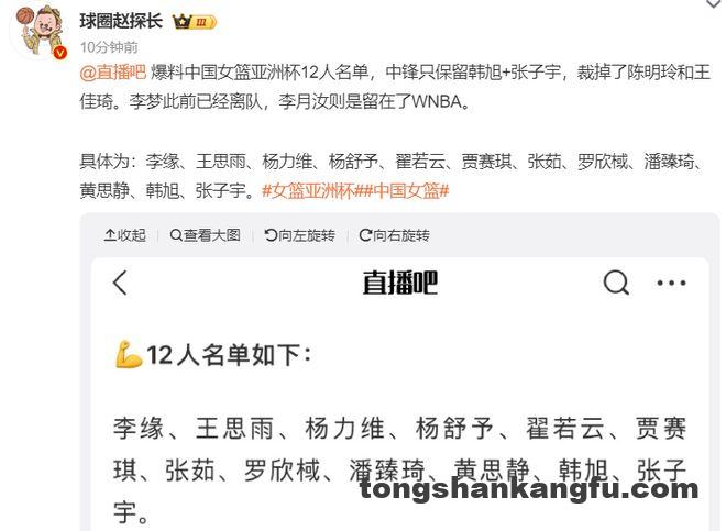 北京时间7月12日,根据媒体直播吧的报道,中国女篮亚洲杯的12人名单已经确定,最终裁掉了陈明伶、王佳琦,中锋位置上只留下了韩旭、张子宇。