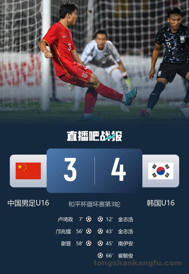 直播吧7月8日讯 北京时间7月8日19:35,U16男足国际足球锦标赛“和平杯”第三轮,中国男足U16在沈阳城市体育场对阵韩国U16。上半场,万项任意球助攻,卢琦政头球破门,金志浩梅开二度反超比分,南伊安再入一球;下半场,谢晋替补登场3分钟传射,邝兆镭破门,崔敏俊利用角球机会破门。
