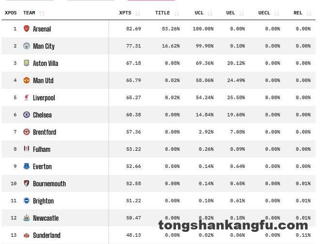 随着英超第28轮比赛的结束,英超积分榜也发生了一定的变化,其中最受关注的自然还是曼城和阿森纳之间的冠军之争。本轮比赛阿森纳是力克切尔西拿到了比赛的胜利,曼城虽然也取胜但仍然在积分榜上落后阿森纳5分。数据分析机构在本轮比赛全部结束后更新了英超的夺冠概率,中阿森纳83.26%领跑,曼城16.62%,维拉0.08%,曼联和利物浦0.02%,这也是有可能夺冠的全部球队。