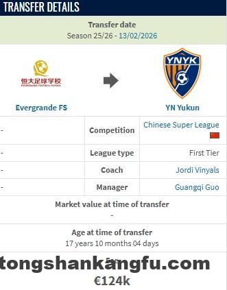 德转显示,云南玉昆约100万人民币从恒大足校签下布尼亚明。