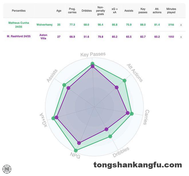 北京时间5月20日,数据网站 DataMB 发布了狼队前锋马特乌斯-库尼亚与阿斯顿维拉前锋拉什福德在2024/25赛季的表现对比数据,结果显示,库尼亚在多项关键进攻指标上均优于拉什福德。