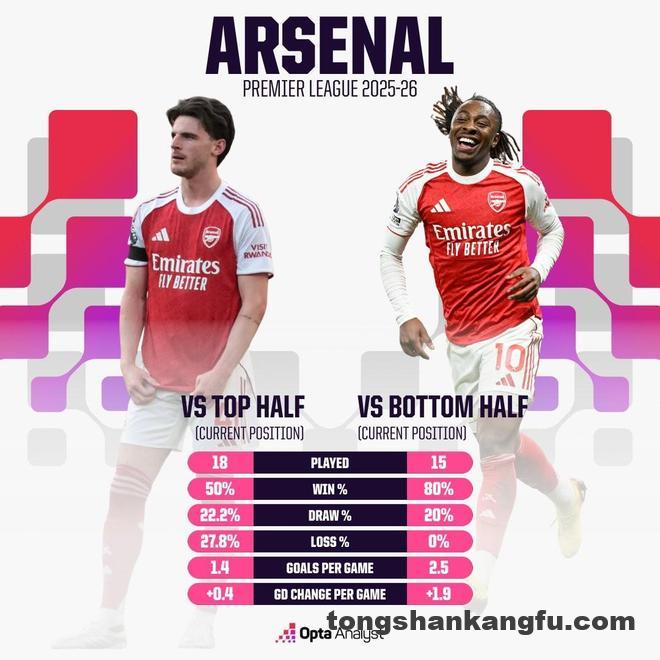 北京时间4月20日,在本赛季英超争冠进入白热化阶段的情况下,来自Opta的统计显示,阿森纳本赛季面对积分榜下半区球队有着十分稳定的表现。