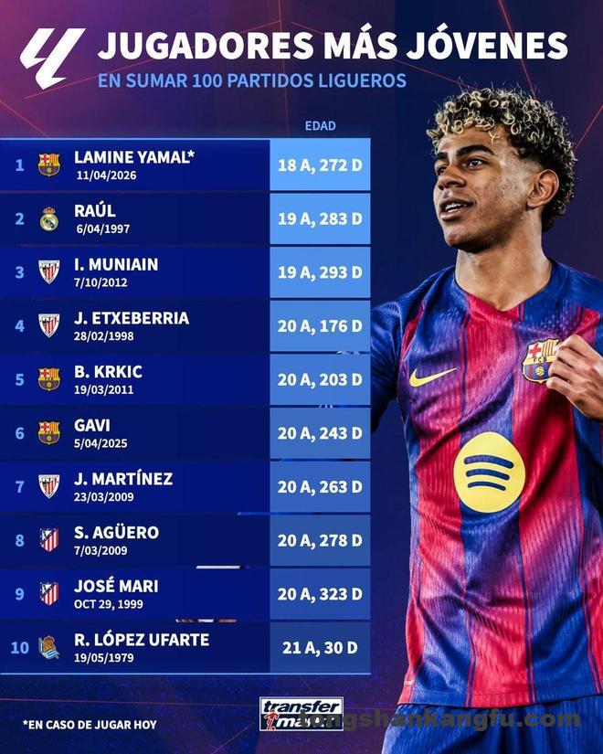 根据统计,本场比赛是亚马尔职业生涯第100次在西甲登场,这位西班牙天才也就此以18岁272天的年纪超越了皇马的传奇球星劳尔,成为西甲历史达成百场里程碑最年轻的球员。