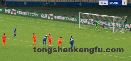 第40分钟,路易斯禁区里解围失误,刘诚宇断球突破被出击的王大雷撞倒,主裁判吹罚点球。第42分钟,吴曦主罚点球,王大雷碰到球但无法阻止皮球入围,申花2-1领先泰山。