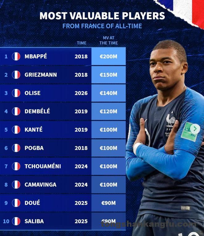 北京时间3月31日,德转列出了法国球员历史身价榜,姆巴佩2亿欧元第一,格列兹曼1.5亿第二,奥利塞1.4亿欧元第三。