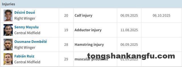 登贝莱从欧冠半决赛开始身体情况就不够好,世俱杯缺席了一半赛程,法甲开赛后一直状况不佳,最终在国家队比赛中拉伤大腿将缺阵2个月。法维安·鲁伊斯从上赛季下半段开始近乎全勤,但他也是在本次FIFA比赛日受伤。