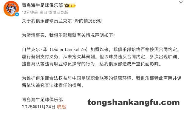 北京时间11月24日晚,中超青岛海牛俱乐部官方发文,回应了关于外援兰克尔-泽的欠薪指控。