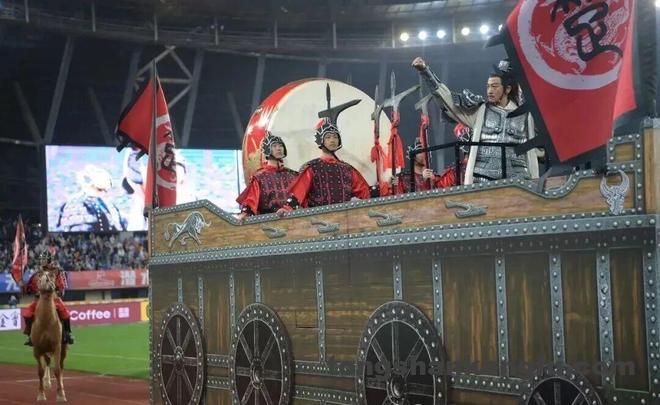 4月18日晚,宿迁梦之蓝・奥体中心座无虚席、声浪震天,2026江苏省城市足球联赛宿迁队主场 对战 南京队的焦点赛事正式启幕。赛前,原创开场演出《霸王归来・燃爆宿迁》惊艳亮相,演员何润东化身西楚霸王项羽,乘战车、伴战鼓、随战马巡场互动,近3万名球迷同声呼应、热血沸腾。