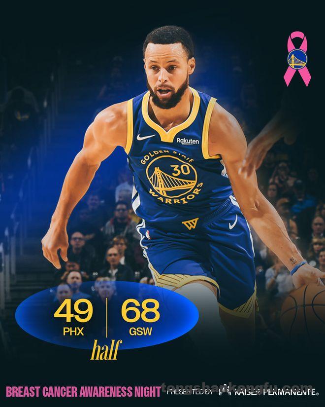 吉莱斯皮在第二节开始后找到准星,连中2个三分球,太阳队追至27-37。勇士队暂停后穆迪回应2个三分球,他率队连拿8分重新拉开。奥尼尔三分回应,戴维斯、希尔德各拿3分,半场前6分30秒时勇士队以55-33领先22分。布克中投暂时止血,希尔德和库明加合取5分,勇士队把优势拉开到25分。邓恩回敬三分率队打出9-2的反击波缩小差距,库里外线开火,又进两个三分球,半场结束时勇士队以68-49领先。