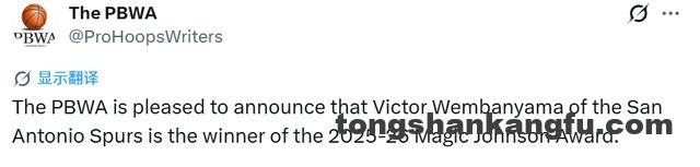 北京时间4月17日,美国职业篮球作家协会今日宣布,圣安东尼奥马刺队的维克托-文班亚马斩获2025-26赛季魔术师约翰逊奖。该奖项旨在表彰赛场表现出众,同时在对接媒体、对待球迷时兼具配合度与优雅风度的NBA球员。