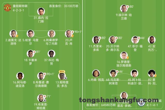 卡里克率队重回四后卫体系,姆伯莫单箭头、身后是阿马德-迪亚洛、B费、多古。瓜帅派出哈兰德突前,过人高手多库和塞梅尼奥分列两侧。