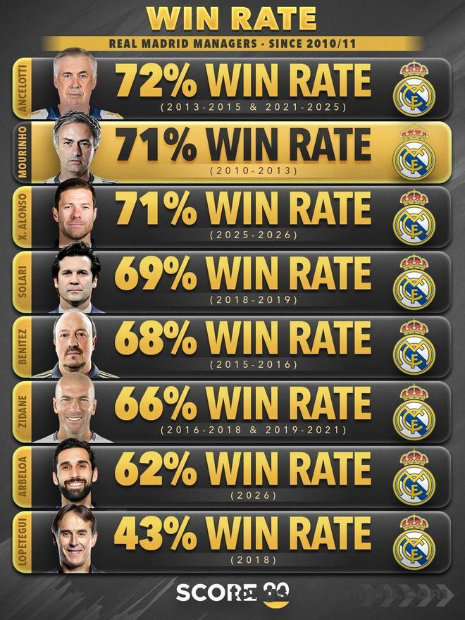 在他此前执教皇马期间,他的胜率在俱乐部历史主帅中位列第二。