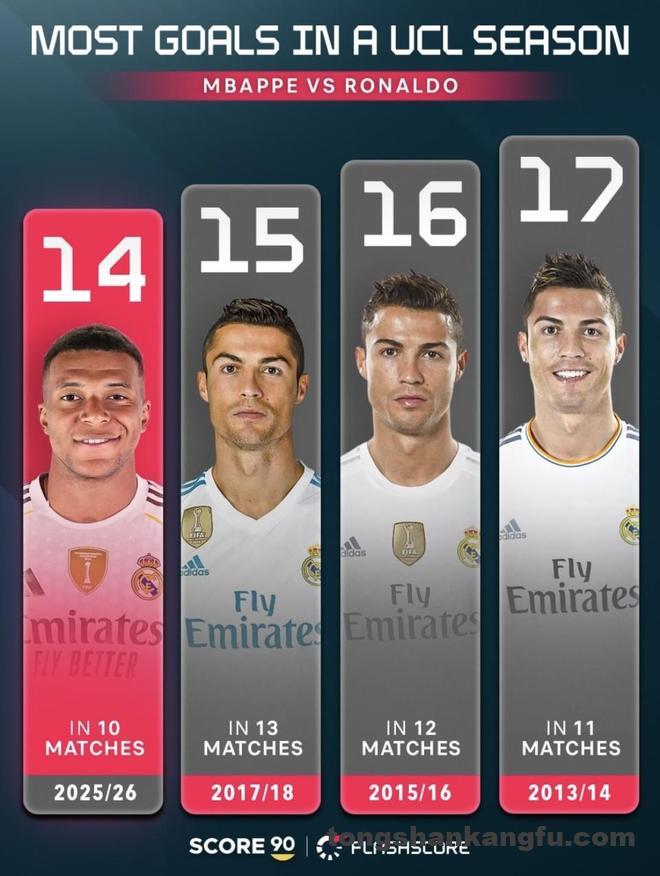 单看进球数,姆巴佩离纪录确实很近。10场14球,这早就不是一般的高产,而是直接杀进了欧冠历史最顶级的单季进球区间。欧足联数据显示,姆巴佩这赛季在欧冠已经有52脚打门,外加1次助攻,说明他的进攻参与度极高,绝不是靠某几场比赛集中爆发刷出来的数据。回看C罗当年11场17球的表现,无论是效率还是总数都压到了极致。姆巴佩现在就差3球,看似一步之遥,但要追的可是欧冠历史最高级别的纪录。