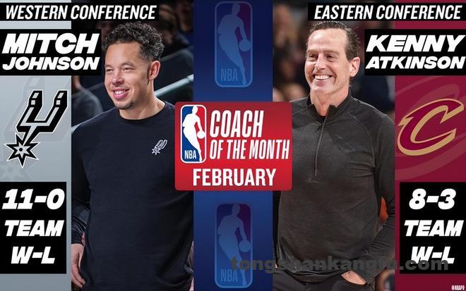 米奇-约翰逊率领马刺打出11胜0负的2月不败战绩,当选西部月最佳教练。阿特金森带领骑士打出8胜3负的2月战绩,当选东部月最佳教练。