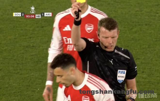马丁内利迅速跑向事发地点,想要快发任意球。他推开了巴罗特并抢下皮球,试图尽快重新开始比赛。这位主裁判颇为震惊,鸣哨后向这名阿森纳前锋出示了黄牌。