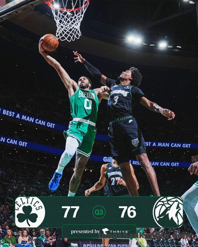 塔图姆在第三节开始后找到准星,独得7分,联手布朗、怀特打出11-0的攻击波,凯尔特人队以55-47重新领跑。麦克丹尼尔斯三分止血,多苏姆也连进两球,森林狼队追至54-58。布朗和普理查德回应5分再次拉开,麦克丹尼尔斯连进两球,布朗三分中的,戈贝尔和麦克丹尼尔斯又拿5分,本节还有4分15秒时森林狼队追至66-69。双方之后各得几分,里德打3分成功,海兰德跑投命中,三节结束时森林狼队以76-77落后1分。