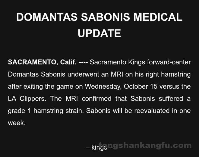 萨博尼斯在季前赛输给快船的比赛中因腿筋问题离场,随后在周五晚上洛杉矶的季前赛收官战中,他因接受检查而缺席。这被认为是一次轻微的拉伤,但萨博尼斯将无法在国王队对阵太阳队的赛季揭幕战,以及对阵爵士队的主场揭幕战中出场。他最早可能在10月27日对阵湖人队的比赛中回归。