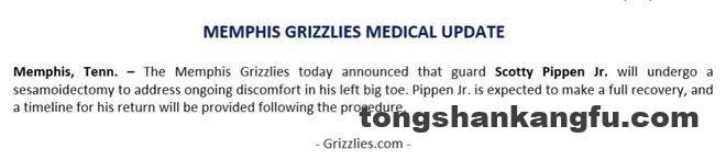 灰熊队官方宣布,后卫小斯科蒂-皮蓬将因左脚大脚趾受伤接受手术,据消息人士透露,他将在12周后重新接受评估。灰熊队表示,小皮蓬将接受籽骨切除术以处理他们所说的“持续不适”,预计他将完全康复。