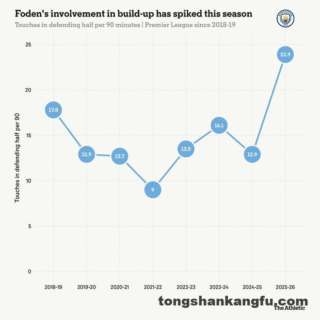 英格兰队主教练托马斯-图赫尔已确信他属于中路,在那里,他对比赛的影响力比以往任何时候都大。罗德里本赛季长期缺阵可能是一个因素,但如下图所示,福登回撤接应、帮助曼城破解对手高位逼抢的次数也达到了前所未有的程度。