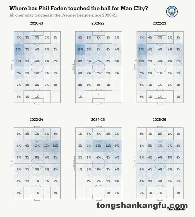 上赛季,他的活动区域更向中路靠拢,但触球点仍集中在进攻三区。本赛季开赛16场以来,他的触球点更均匀地分布在整个球场。