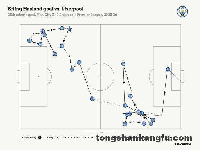 当哈兰德头球顶入马特乌斯-努内斯的传中时,这意味着曼城所有10名外场球员都在这次纵贯全场的推进中触球了。整整20脚传递才造就了这次右路传中,而这次进攻片段也浓缩了主队在上半场的统治力,他们总能神奇地多出一名接应点,从而化解了利物浦施加的任何压迫。
