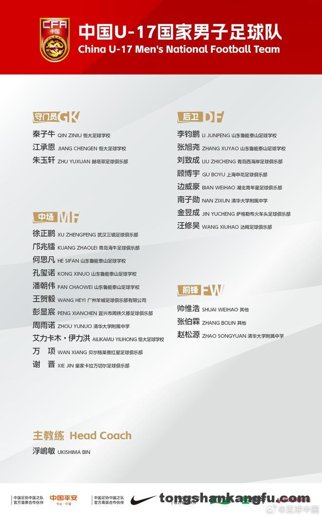 北京时间4月29日,中国U17官方公布亚洲杯名单,邝兆镭、万项、谢晋、帅惟浩在列。