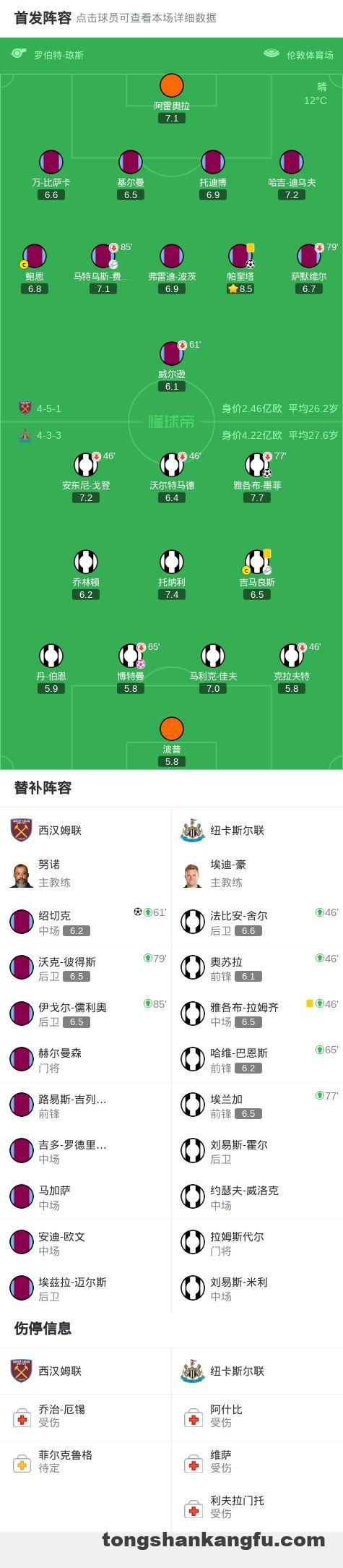 北京时间11月2日,英超联赛第10轮展开角逐,西汉姆联坐镇主场迎战纽卡斯尔联。吉马良斯助攻雅各布-墨菲闪击破门。帕奎塔一记世界波将比分扳平。上半场临近结束前,博特曼不慎自摆乌龙,西汉姆联借此反超比分。下半场,波茨进球越位在先,绍切克补射破门为西汉姆联锁定胜局。最终,西汉姆联3-1逆转战胜纽卡斯尔联。