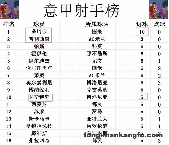 射手榜方面,劳塔罗今天虽然错失了空门,但还是传射建功造2球,他也终于是让意甲本赛季有人进球上双,10球继续领跑。普利西奇8球位列第2,霍伊伦,恰尔汗奥卢,莱奥等人6球并列第3。卡斯特罗打入一球后,追上苏莱,斯卡马卡等人5球刚好挤入前十。
