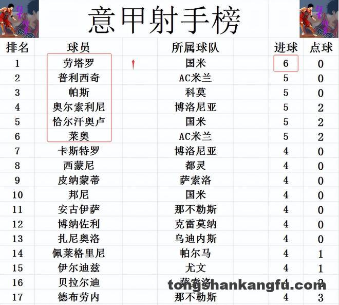 射手榜方面,终于是有人突破5球“大关”,劳塔罗昨晚梅开二度,超过普利西奇等人,6球登顶成功。普利西奇,帕斯,莱奥,恰尔汗奥卢和奥尔索里尼5球并列第2。西蒙尼,德布劳内,伊尔迪兹等人4球挤入前十。
