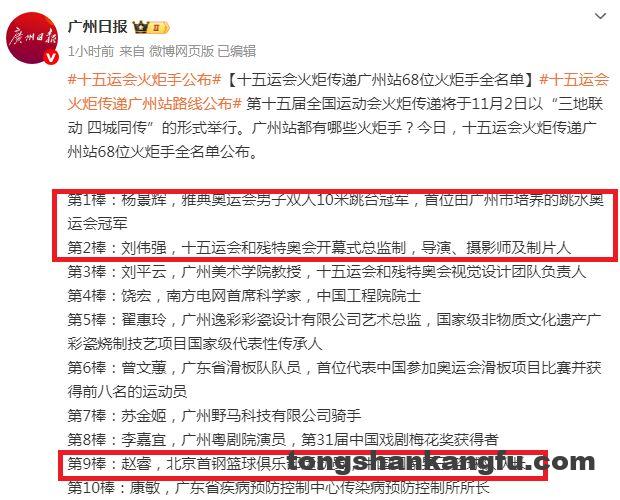 北京时间10月31日,根据《广州日报》报道,第15届全运会火炬传递广州站的68位火炬手名单全部出炉,中国男篮队长、广东全运男篮球员赵睿入选,他成为广州站第9棒火炬手,而第一棒火炬手是雅典奥运会冠军杨景辉。